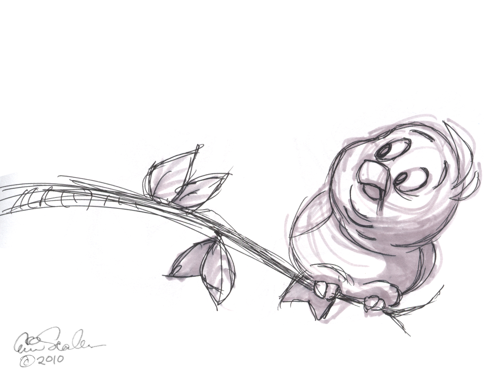 Anyway, to tie this all in to my artwork for today, Chris Sanders directed "How to Train Your Pet Dragon". I haven't seen it (yet!), but was a bit disappointed that from the trailers it didn't look like much of the film bore his design sense, except for the main black dragon, Toothless. Toothless has all of the Sanders earmarks, large slanted eyes, round head, bulbous body and tiny little claws. Anyway, I was doodling in my sketchbook and said to myself, "Self, you should try drawing something like Chris Sanders would draw,".